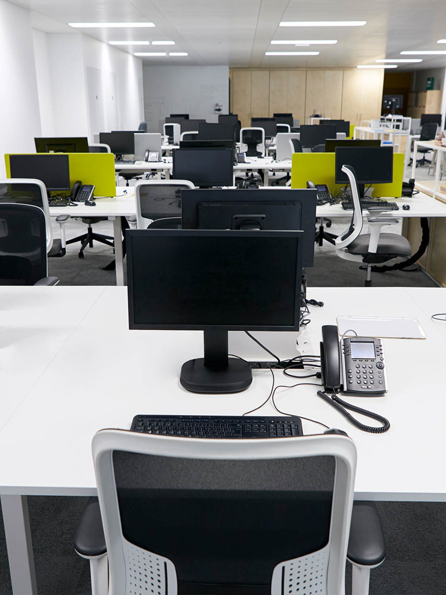- Fully furnished: desks, pedestals, ergonomic chairs and cabinets